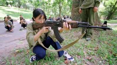 a Vietnamese high school girl practises taking aim with an AK-47 assault rifle during military training for students in Hanoi September 8 2000 high school and university students in communist ruled Vietnam take part in such training every year as part of a national defence programme"