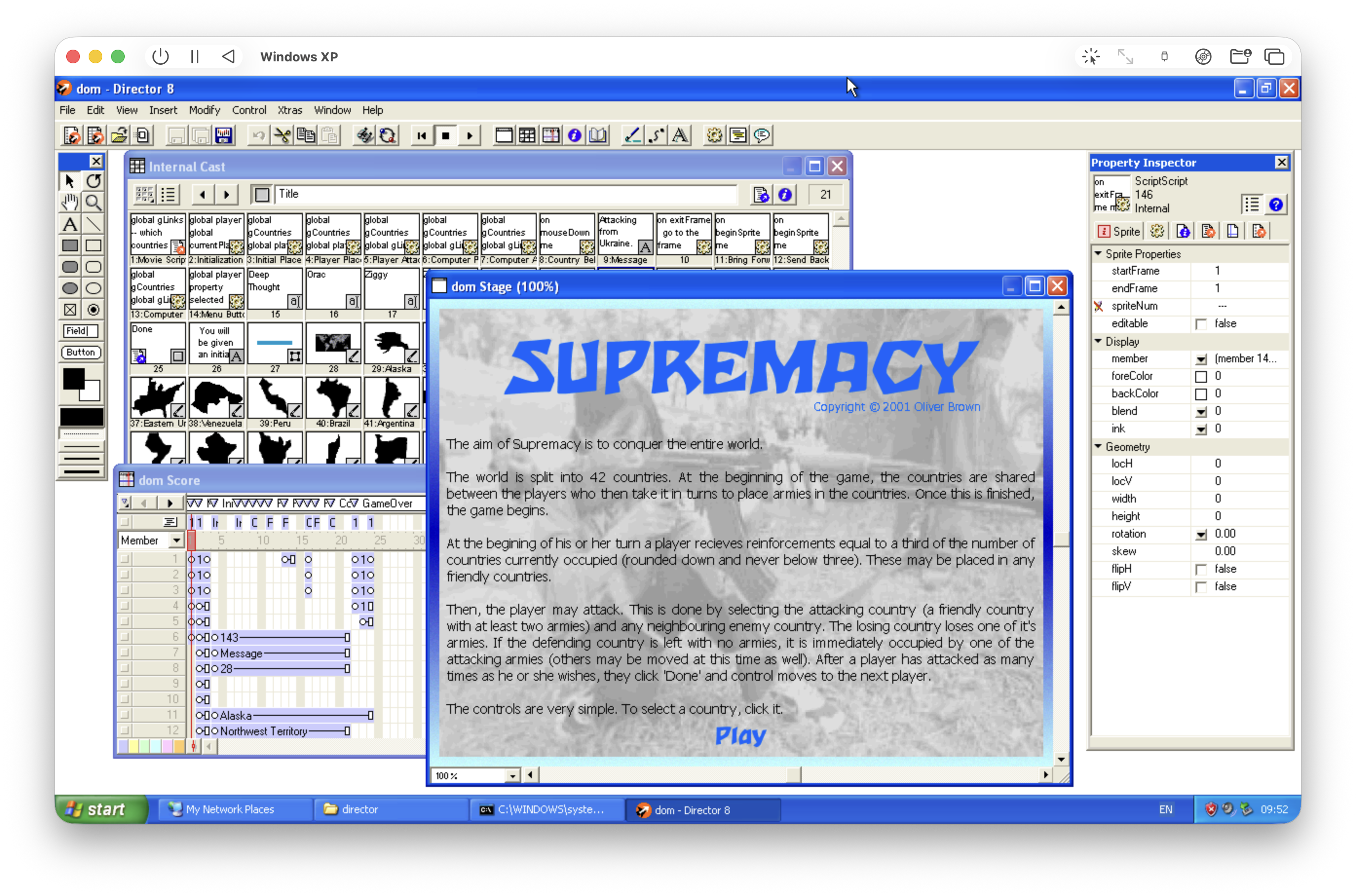 Opening in the project in Macromedia Director on a Windows XP VM: