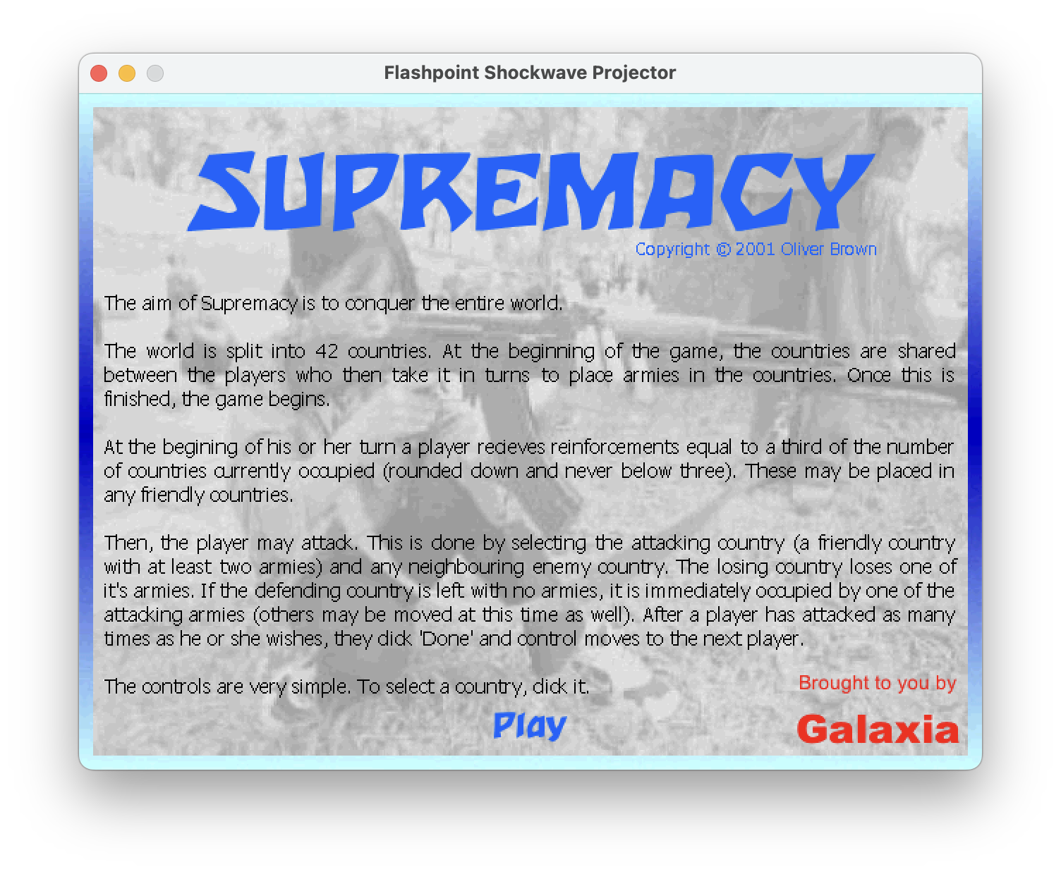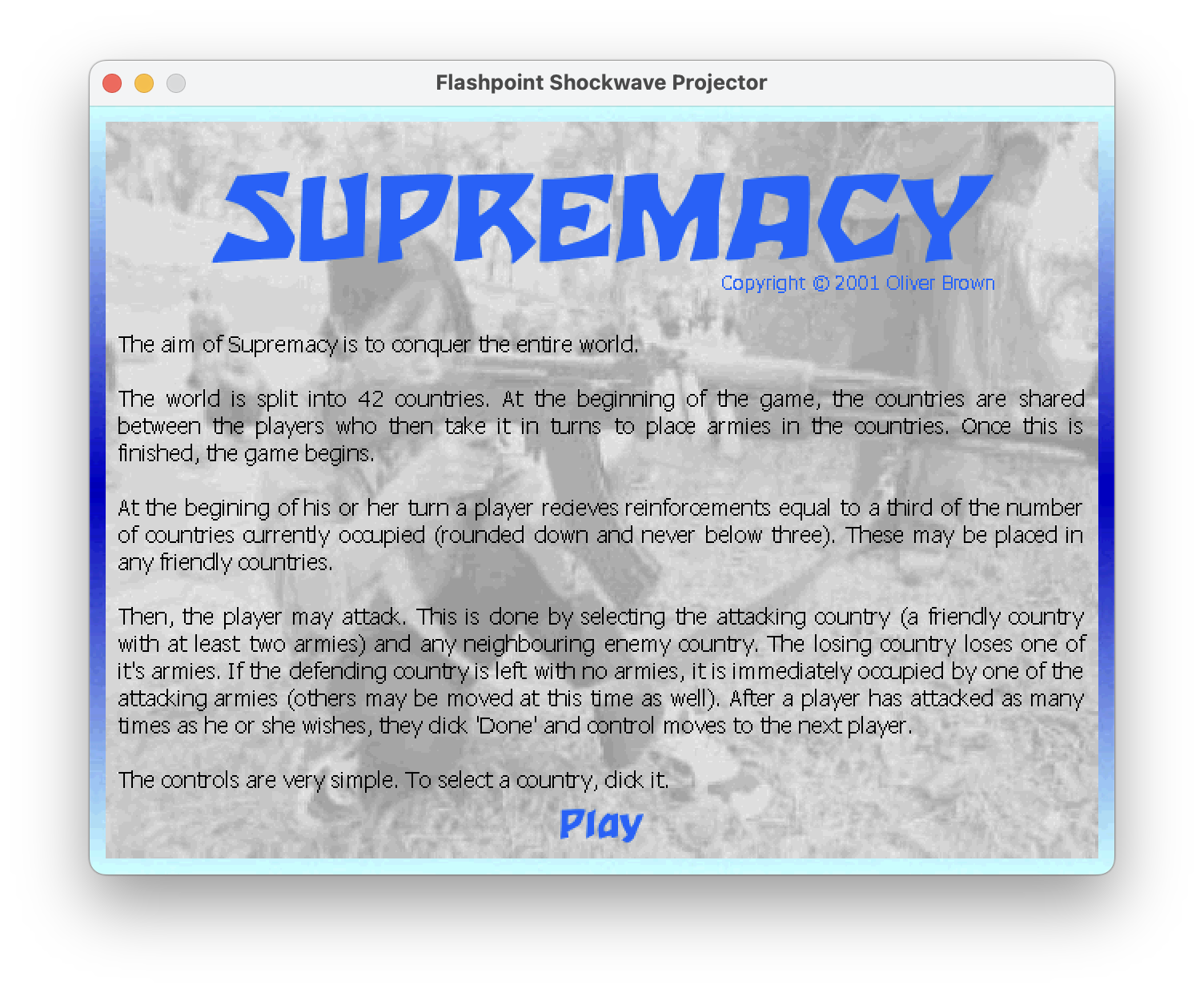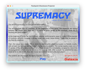 Supremacy is heavily based on the “Strategy Game” code sample included with that book. So much so, that the “Copyright © 2001 Oliver Brown” with no attribution makes me cringe a little now. So now is as good a time as any to thank Gary Rosenzweig for writing the book (and the code). I did eventually take it further, but that is for another post.